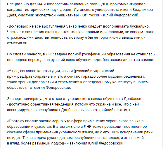 "В "ЛНР" тоже происходит постепенное сужение сферы применения украинского языка, но о его 100% искоренении речи не идет. Такая задача руководством республики не ставилась, и это, на мой взгляд, более разумный подход", - добавил он.
