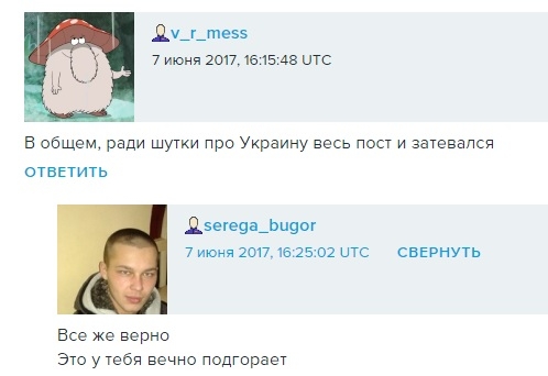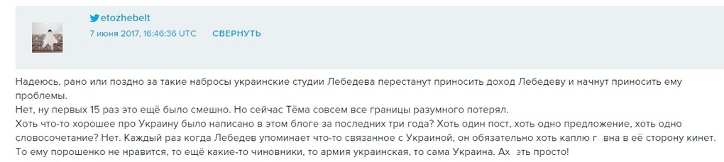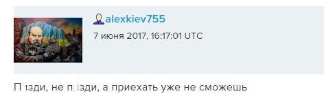 "Про Украину ты в*тно-прилепинское сказал, потому что обиделся на запрет на въезд. И с безвизом ты спор проиграл. И разные украинцы и русские. И запомните: все россияне - дизайнеры, гопники, чиновники, в*тники, либералы - мы разные, никакие мы не братья. Как англичане и ирландцы, как сербы и хорваты. Вроде рядом, а х*юшки - абсолютно разные мировосприятия. Засим ариведерчи. И да визовый режим между нами - за*бок. Будем уважать друг друга, как интеллигентные люди", - отметил один из комментаторов.