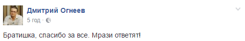 "Похоронили братишку. Завтра ещё. 10 двухсотых за сутки... Будь проклятая эта война!" - написал на своей странице в Facebook Дмитрий Огнеев.