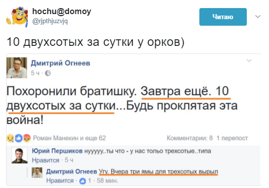 Один из постов прокомментировал другой сторонник "Л/ДНР", который подчеркнул, что "власти" говорят только о раненых, на что Огнеев ответил: "Угу. Вчера три ямы для трехсотых вырыл".