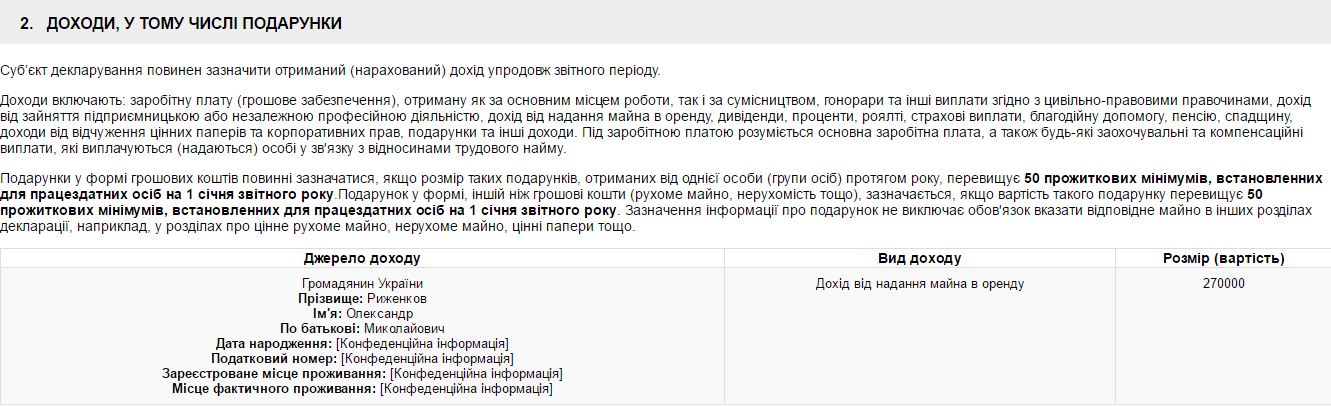 Согласно документу от 9 июня 2017 года, народный депутат получил 270 тыс. грн. от предоставления в аренду имущества Александру Рыженкову. Как выяснилось, Александр Николаевич является отцом Юрия Рыженкова, гендиректора металлургического холдинга Рината Ахметова "Метинвест". Кстати, Александр Рыженков сам в прошлом был директором Донецкого металлургического завода.