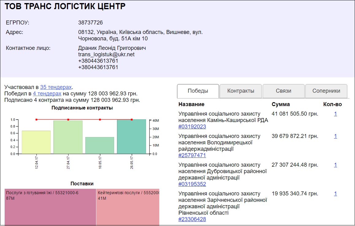 Те що «Транс Логістик Центр» є чи не головним освоювачем чорнобильських коштів ілюструє і система аналітики Прозорро – впродовж цієї весни фірма виграла понад 128 мільйонів гривень на харчування чорнобильців у Волинській та Рівненській областях (фото клікабельне):