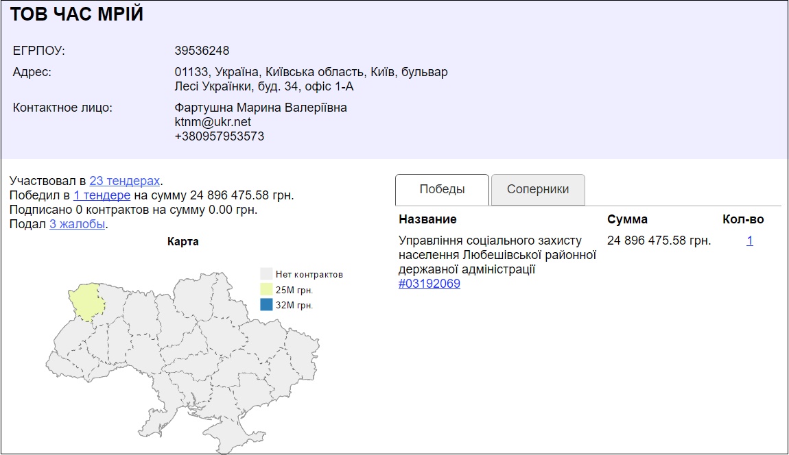 Підприємство «Час мрій» цьогоріч не багате на перемоги – за даними системи аналітики Прозорро фірма отримала лише одну перемогу у Любешівському районі (фото клікабельне):