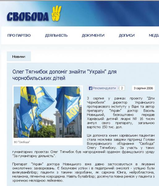 “Нагадаємо, що спiвпраця лiдера ВО “Свобода” Олега Тягнибока, який вже тривалий час поспiль займається органiзацiєю допомоги дiтям, котрi постраждали вiд Чорнобиля, з фiрмою “Новiцькi Фарма” та безпосередньо з доктором Василем Новицьким почалася кiлька рокiв тому”.