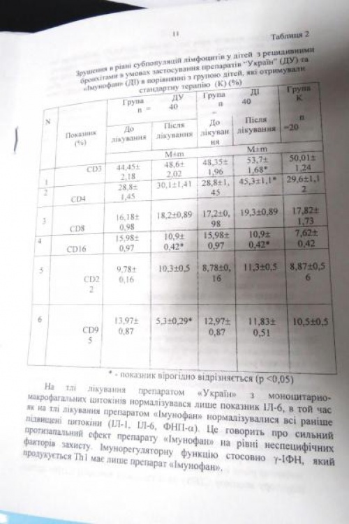 — Ось подивiться цю таблицю з тодiшнього нашого звiту. Тут ми вводили дiткам новий препарат “Україн” й для порiвняння старий — iмунофан, який використовують у лiкуваннi вже рокiв п’ятдесят, i коштує вiн аж нiяк не стiльки, як “Україн”, — 800 гривень. Ми спостерiгали гемоглобiни, якi захищають, до введення препаратiв i реакцiю пiсля. Ось маємо новий i дорогий “Україн”: 10,2 до лiкування й 11,02 — пiсля. Ну хiба це показник? Ну трошки змiнилося на краще. А ось старий i дешевий — iмунофан. Тут iмунофан дає значно кращий показник.