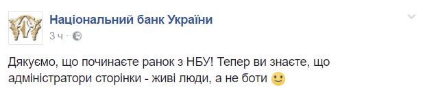 В Нацбанке прокомментировали инцидент с юмором. "Спасибо, что начинаете утро с НБУ! Теперь вы знаете, что администраторы страницы – живые люди, а не боты", - говорится в сообщении.