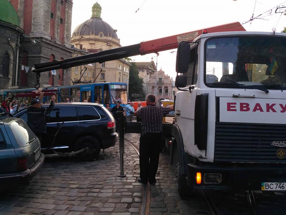 У центрі Львова утворивсь затор із трамваїв через неправильно припаркований позашляховик «Volkswagen Touareg» (київські номери) на вул. Підвальній.