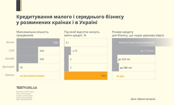 В Украине около 2 миллионов малых предприятий, на которых работает 6,5 млн. человек. Если им удается взять кредит в банке, то они платят кредиты под 15-30% годовых. В богатых странах правительства создали пограммы, которые позволяют малому и среднему бизнесу (МСБ) брать кредиты под 2% годовых.