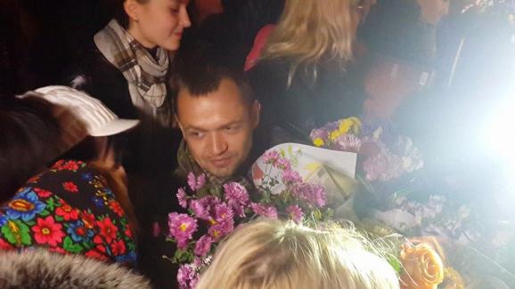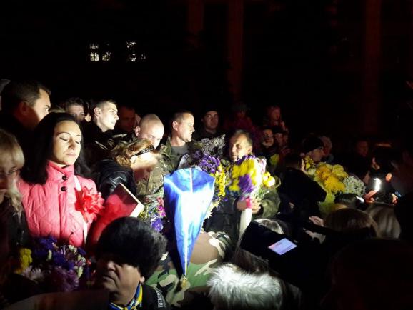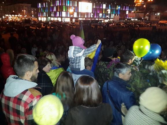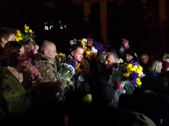 У Дніпропетровську у вівторок увечері на площі Героїв Майдану урочисто зустрічали військовослужбовців, які захищали Донецький аеропорт і повернулись додому на короткий відпочинок