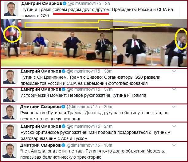 Затем организаторы саммита рассадили двух президентов в разных концах большого зала. "Путин и Трамп совсем рядом друг с другом: Президенты России и США на саммите G20", - написал Смирнов.