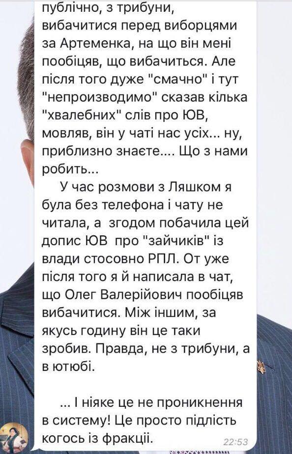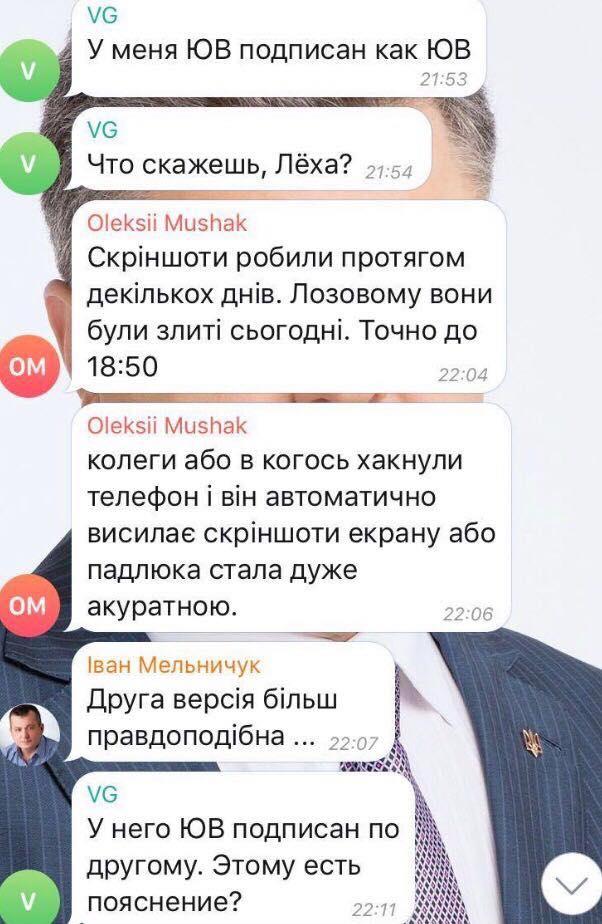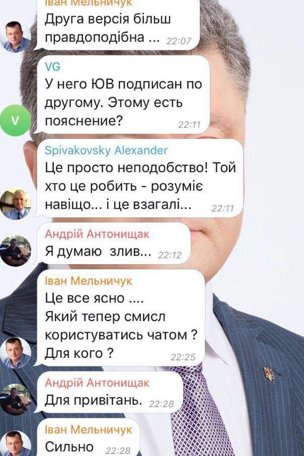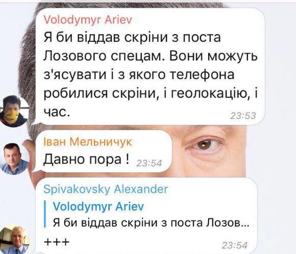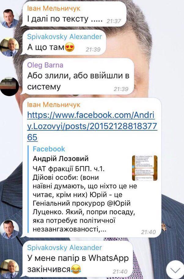 “Іван Мельничук – це колишній голова Літинської РДА на Вінничині. Вірний боєць Петра Олексійовича. Парадокс, але я його щиро поважаю. При тому, що ми колись побилися. Іван не змінює господаря. Він вірний. На відміну від Юрія Віталійовича і йому подібних. Яких в парламенті більшість, на жаль”, – написав Лозовий в першій частині публікацій внутрішнього чату БПП.