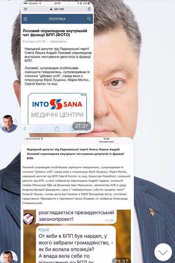 Раніше повідомлялося, що народний депутат від Радикальної партії Олега Ляшка Андрій Лозовий оприлюднив першу частину внутрішнього листування народних депутатів із фракції БПП.
