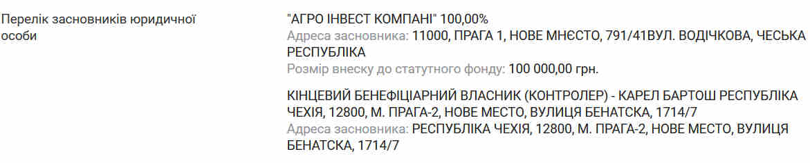 Бенефіціарами ТОВ є «АГРО ІНВЕСТ КОМПАНІ", що знаходиться у Празі, Чеська Республіка та Карел Бартош також із Праги.