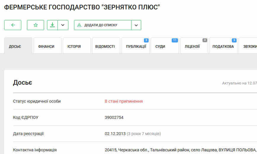 Фермерське господарство «Зернятко плюс», засноване на Черкащині три з половиною роки тому, нині з невідомих причин припиняє свою діяльність.