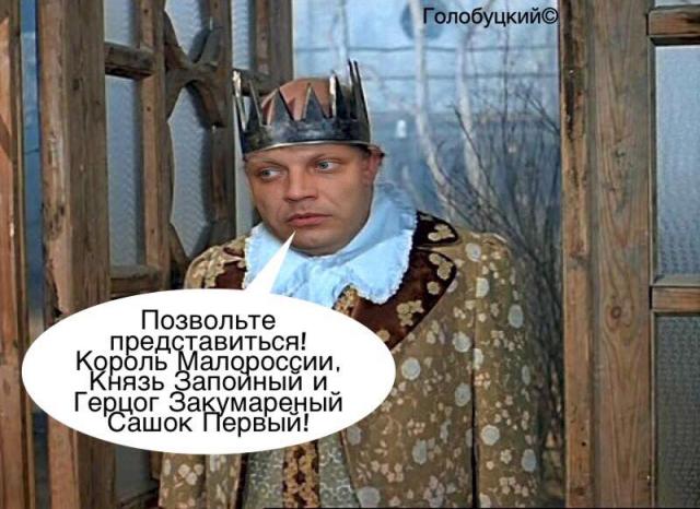 Так, политолог поделился фотожабой, на которой главарь боевиков изображен в образе «короля» с подписью: «Позвольте представиться! Король „Малороссии“, Князь Запойный и Герцог Закумареный Сашок Первый».