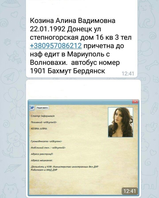 "Знакомьтесь, Алина Козина, 1992 года рождения. Сотрудница "МИД ДНР". Странно, почему в такой ответственный и исторический для "молодой республики" момент, Алина решила рвануть в Мариуполь", - говорится в тексте.