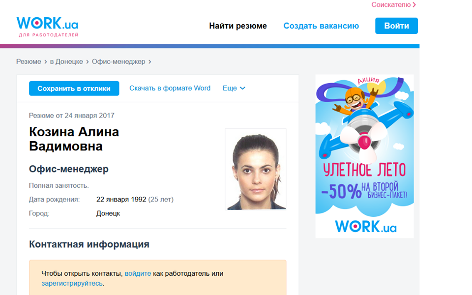 "Кроме того, служба в правительстве сепаратистов Алину явно не устраивала, ведь еще в январе девушка активно искала работу", - говорится в комментарии к резюме Козиной на сайте по трудоустройству.