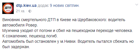 В Киеве вечером, 20 июля, водитель автомобиля Rover, убегая от полиции, сбил пешехода, который скончался на месте от полученных травм.