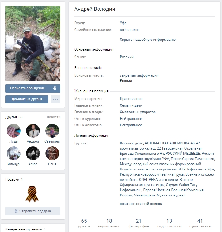 Стало известно, что россиянин приехал на Донбасс из города Уфа (Республика Башкортостан) транзитом через Ростов-на-Дону. Проходил службу в одном из подразделений спецназа террористов "ДНР", регулярно фотографируясь на Донбассе с огнестрельным оружием и гранатометом в руках. Неизвестно, при каких именно обстоятельствах украинские бойцы уничтожили россиянина, однако точно известно, что убит он был в минувший понедельник, 17 июля.