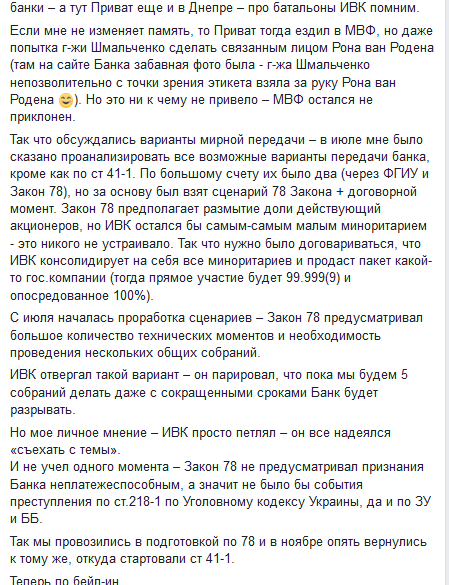 Так что обсуждались варианты мирной передачи – в июле мне было сказано проанализировать все возможные варианты передачи банка, кроме как по ст 41-1. По большому счету их было два (через ФГИУ и Закон 78), но за основу был взят сценарий 78 Закона + договорной момент. Закон 78 предполагает размытие доли действующий акционеров, но ИВК остался бы самым-самым малым миноритарием — это никого не устраивало. Так что нужно было договариваться, что ИВК консолидирует на себя все миноритариев и продаст пакет какой-то гос.компании (тогда прямое участие будет 99.999(9) и опосредованное 100%).