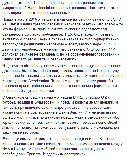 С бейл-ином ситуация такова – я нашла BRRD (спасибо GIZ с которым ездили в Бундесбанк) и потом и юристы анализировали. И там есть признание бейл-ина третьих стран. По евробондам – нужно получать согласование в Банке Англии. И я не испытываю большого оптимизма по данному поводу – как в отношении сугубо юридических аспектов, так и политического – боюсь, после Brexit Англия не пойдет на такой урон репутации страны с максимальной защитой инвесторов.
