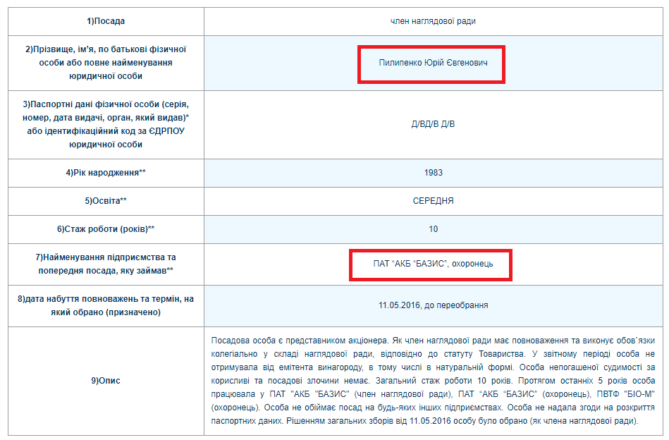 В 2015, еще до того, как АКБ «Базис» вытряс деньги из НБУ, у него сменились собственники, а сам он изменил место дислокации. Сначала компания прописалась в Днепропетровске, а в прошлом году переехала в упомянутый Бахмут. Незадолго до этого принадлежащая семье Арсена Авакова компания «Инвестор» и подконтрольное ей ООО «Инвестор-Фонд» вышли из акционеров АКБ «Базис», а ее новым мажоритарным собственником стала малоизвестная компания «Био-М» из Бахмута. Владелец последней — малоизвестный местный житель Евгений Пилипенко — стал новым гендиректором АКБ «Базис». Об этом человеке известно то, что он является отцом Юрия Пилипенко, который ранее работал охранником «Базиса» и с 2016 г вместе с несколькими безработными он вошел в наблюдательный совет АКБ.