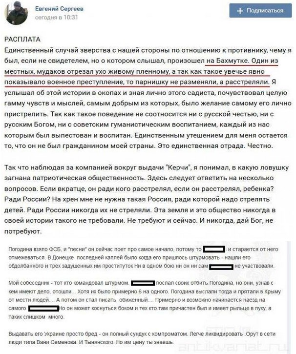 Кроме того, сейчас террористы описывают и другие преступления Погодина (смотри скрины). Например, якобы он задушил трех проституток, совершил многочисленные грабежи и убийства. В конце концов, из ДНР в Крым Погодина выгнали свои же, причем при этом был убит его охранник, а он сам ранен.