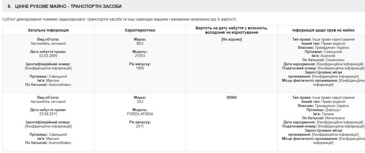 Судя по декларациям, Савицкий и Дорошук делят одну и ту же машину – «ЗАЗ» 2011 года выпуска. Так, собственником авто является Дорошук, а за Савицким остается право его водить.