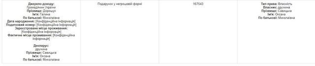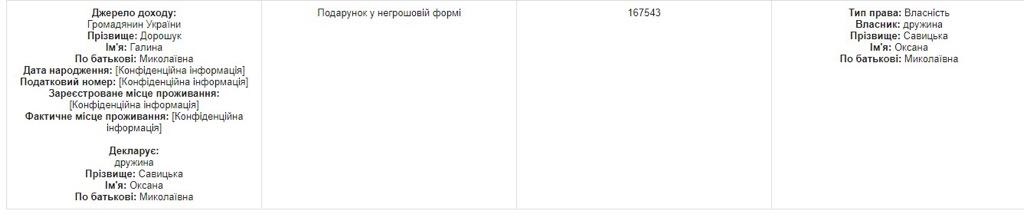 Так, согласно документу, Галина Дорошук подарила его супруге Оксане Савицкой подарок в нематериальной форме стоимостью 167 тысяч 543 грн.