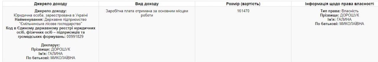 Итак, за весь прошлый год «Емильчинское лесное хозяйство» выплатило Галине Дорошук зарплату в размере 161 тысячи 470 грн. То есть, эта сумма – меньше, чем ее нематериальный подарок жене Максима Савицкого. Как такое возможно?