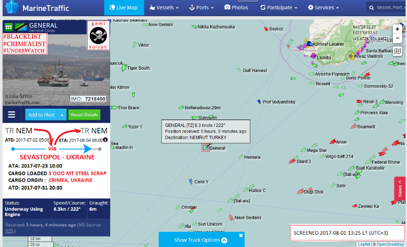 По информации издания, судно GENERAL c грузом 3 тыс. тонн металлолома крымского происхождения из порта Севастополь 4 августа прибыло на якорную стоянку порта Немрут (Турция). Портклиранс и грузовые документы выписаны оккупантами Крыма и подписаны фейковым капитаном порта Севастополь, чья подпись ничтожна и не имеет юридической силы. Фактически, груз на борту судна является крупной товарной партией контрабанды.