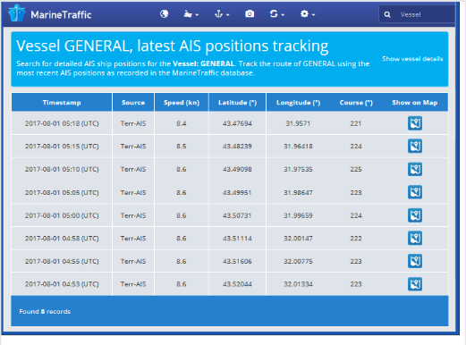Пролив Босфор судно прошло 2 августа в 21:30 по местному времени. В рапорте властям пролива “SP-1” капитан судна указал, что следует на выгрузку в порт Альяга, Турция из российского порта Ростов на Дону. Однако проверка по базе судозаходов в российские порты не подтверждает, что судно заходило в порт Ростов на Дону. А также в этой базе можно обнаружить что с 1 января 2017 года по сегодняшний день судно GENERAL с imo номером 7218400 вообще не посещало ни один порт страны-агрессора.