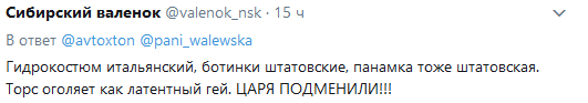 «Гидрокостюм итальянский, ботинки штатовские, панамка тоже. Торс оголяет как латентныйы гей. Царя подменили», — подчеркнул пользователь под ником «сибирский валянок».