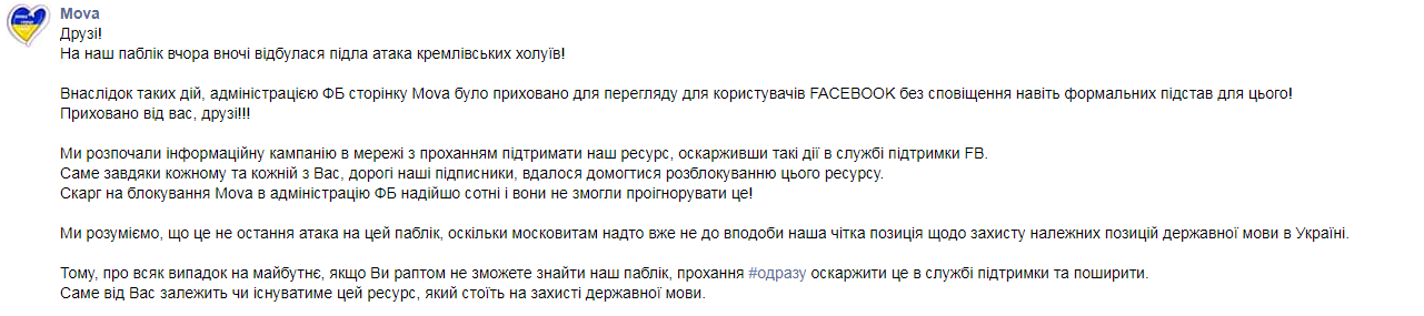 Позже активист добавил, что паблик Mova все же разблокировали, но при этом в Facebook так и не удосужились предоставить каких-либо объяснений.