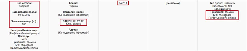Не менш цікавою є декларація сестри прокурора. З неї видно, що у 2010 році матір прокурора стала власницею квартири в Києві на 268 м². Вказана в декларації вартість, у яку обійшлося Мирославі Йосипівні це помешкання, – 553 тис. грн. За нашою інформацією, дана квартира знаходиться за адресою вул. Володимирська, 49А, що в історичному центрі столиці. Сьогодні подібне житло в цьому будинку коштує щонайменше 1,8 млн дол, або 46 млн грн!