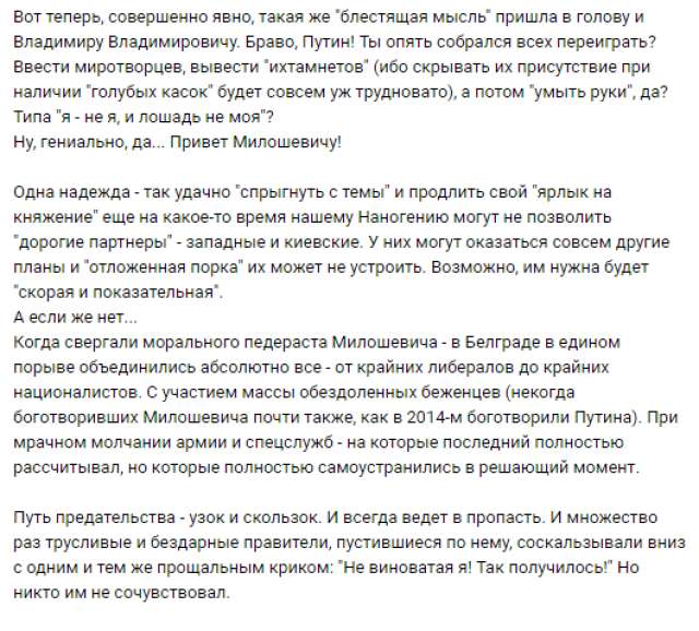 Так, Гиркин в качестве примера приводит действия югославского диктатора Милошевича, который также согласился на введение миротворцев, что привело к падению его режима. Гиркин пишет: «Вот теперь, совершенно явно, такая же «блестящая мысль» пришла в голову и Владимиру Владимировичу. Браво, Путин! Ты опять собрался всех переиграть? Ввести миротворцев, вывести «ихтамнетов» (ибо скрывать их присутствие при наличии «голубых касок» будет совсем уж трудновато), а потом «умыть руки», да? Типа «я — не я, и лошадь не моя»?