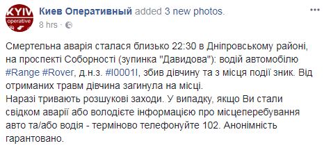 "Смертельная авария случилась около 22.30 в Днепровском районе, на проспекте Соборности, водитель автомобиля Range Rover сбил девочку и сбежал с места происшествия. От травм девочка скончалась на месте", - написано в сообщении.
