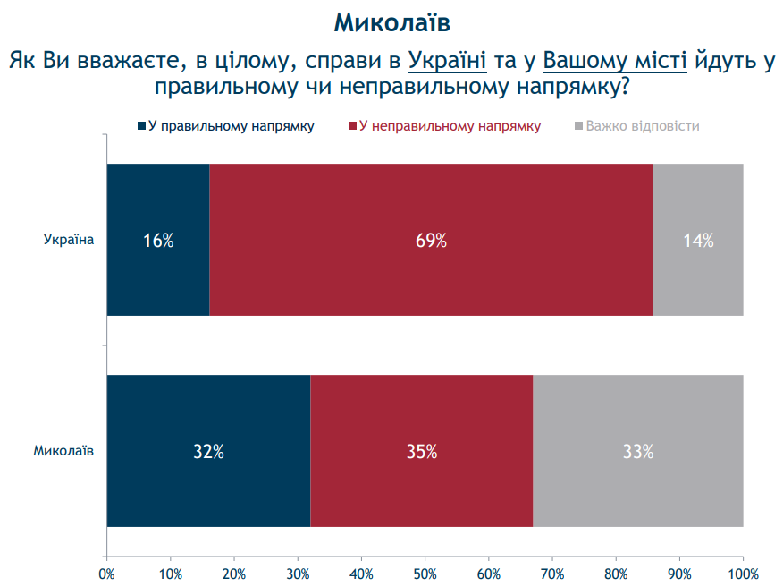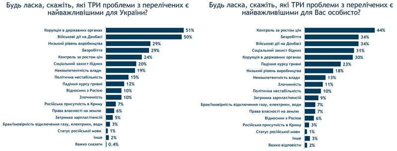 Главной проблемой страны украинцы считают коррупцию, а сами больше всего тревожатся из-за роста цен и безработицы. Причем жизнью своих городов люди довольны гораздо больше, чем жизнью страны. Большинство не одобряют ни Президента, ни Кабмин, ни Верховную Раду и хотят досрочных парламентских выборов, прогнозируемая явка на которых составит 60%.