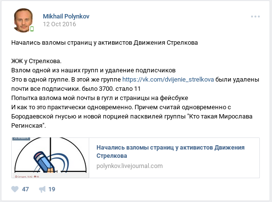 Столкновение великого палководца Гиркина с хакерами случилось 12-го октября 2016 года, и привычно началось с боли и унижения. Куда-то пропал «Живой журнал» и другое движимое интернет-имущество. Мы и не думали писать что-то от его имени. Переплюнуть лаконичную цитату командарма «Новороссии» («нам всем …!») не так уж и легко, но нужно же было чем-то его занять. Целью атаки был Михаил Полынков с позывным «Хрусталик».