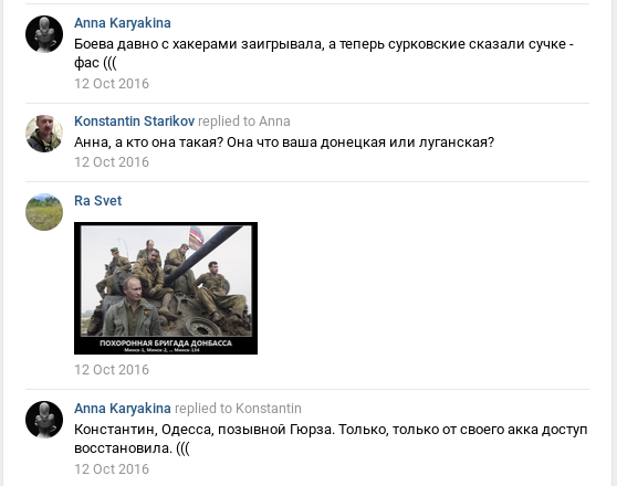 Гюрза Итак, прихлебатели Гиркина, громко орущие о том, какие они патриоты, уничтожают группы, занимающиеся помощью Донбассу, информирующие о политзаключенных, выявляющие мошенников. Так на кого работают эти патриоты? И есть ли среди них искренние идиоты или там все на зарплате от СБУ? Или это выполняется заказ не СБУ, а лично Авакова, с которым я сейчас воюю? Уж больно хочется кое-кому меня дискредитировать. Но этот вопрос оставим на рассмотрение российских правоохранительных органов.Хрусталик Надеюсь, теперь никого не удивляет почему 3 тысячи бумажных анкет добровольцев из СДД перекочевали в СБУ. В заключение, я хочу сказать, что допизделись не мы, а вы. Если за вами, блядями, стоит аппарат Суркова, это еще не значит, что вы сила. Сила в правде. А она за нами. И рано или поздно вы ответите за всё.