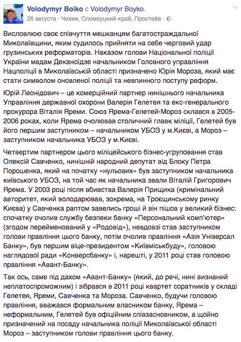 По “странному” стечению обстоятельств банк Авант до 2014 года возглавлял новый губернатор Николаевской области Алексей Савченко. Как заявлял сам Савченко, до банкротства банка он был его совладельцем. А помогали управлять банком бывшему милиционеру и будущему губернатору сын тогдашнего Генпрокурора — Валерий Ярема и экс-сотрудник УБОПа МВД и будущий министр обороны Украины Валерий Гелетей.