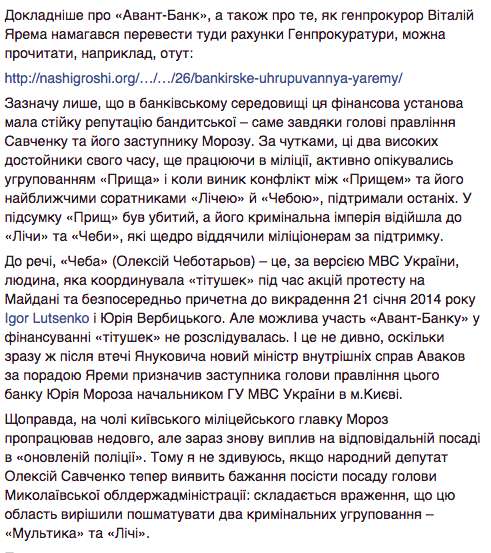 К слову, Авант-банк в годы, когда им управлял «квартет» Савченко-Лебедев-Гелетей-Мороз, засветился и в нескольких других коррупционных скандалах. Например, через счета этого банка проходили явно мошеннические схемы с Укрпочтой, которая по многократно завышенным ценам отправляла агитационные письма избарателям, а также при попытке перевести счета Генпрокуратуры на обслуживание в этот банк.