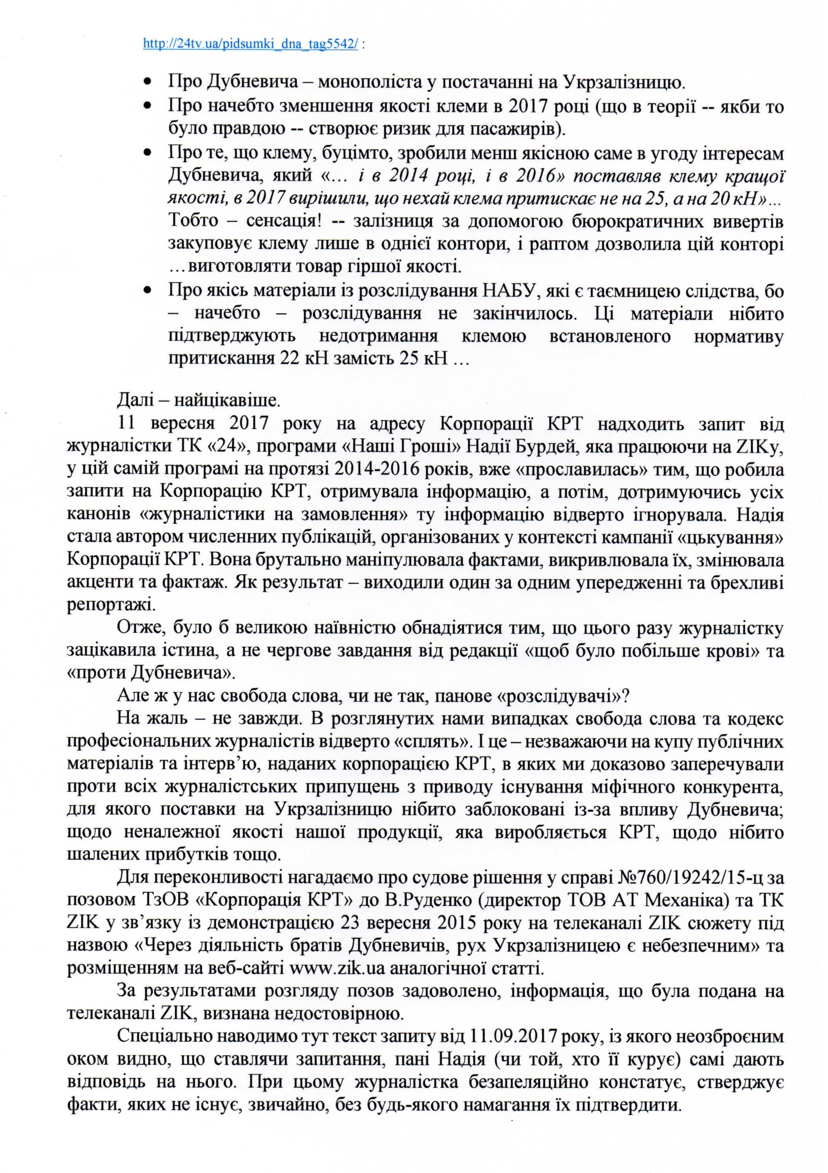 11 вересня 2017 року на адресу Корпорації КРТ надходить запит від журналістки ТК «24», програми «Наші Гроші» Надії Бурдей, яка працюючи на ZIKу, у цій самій програмі на протязі 2014-2016 років, вже «прославилась» тим, що робила запити на Корпорацію КРТ, отримувала інформацію, а потім, дотримуючись усіх канонів «журналістики на замовлення» ту інформацію відверто ігнорувала. Надія стала автором численних публікацій, організованих у контексті кампанії «цькування» Корпорації КРТ. Вона брутально маніпулювала фактами, викривлювала їх, змінювала акценти та фактаж. Як результат – виходили один за одним упередженні та брехливі репортажі.