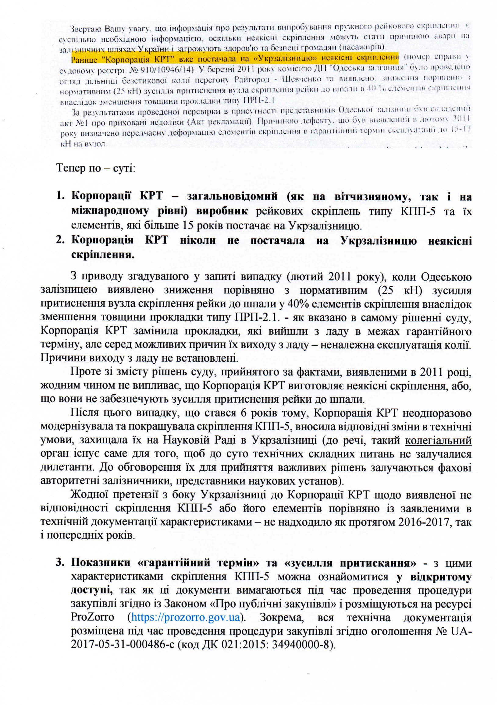 Жодної претензії з боку Укрзалізниці до Корпорації КРТ щодо виявленої не відповідності скріплення КПП-5 або його елементів порівняно із заявленими в технічній документації характеристиками – не надходило як протягом 2016-2017, так і попередніх років.