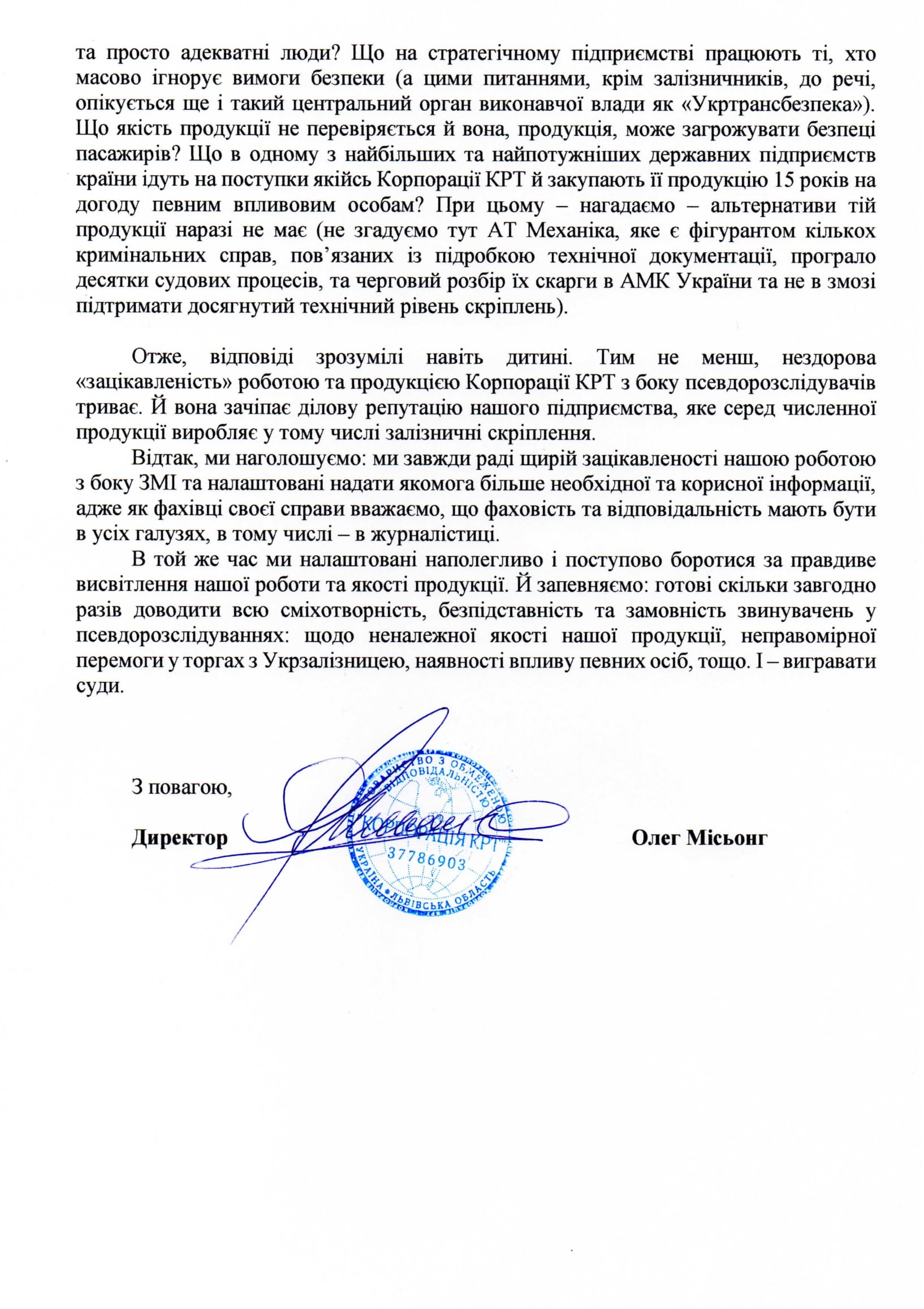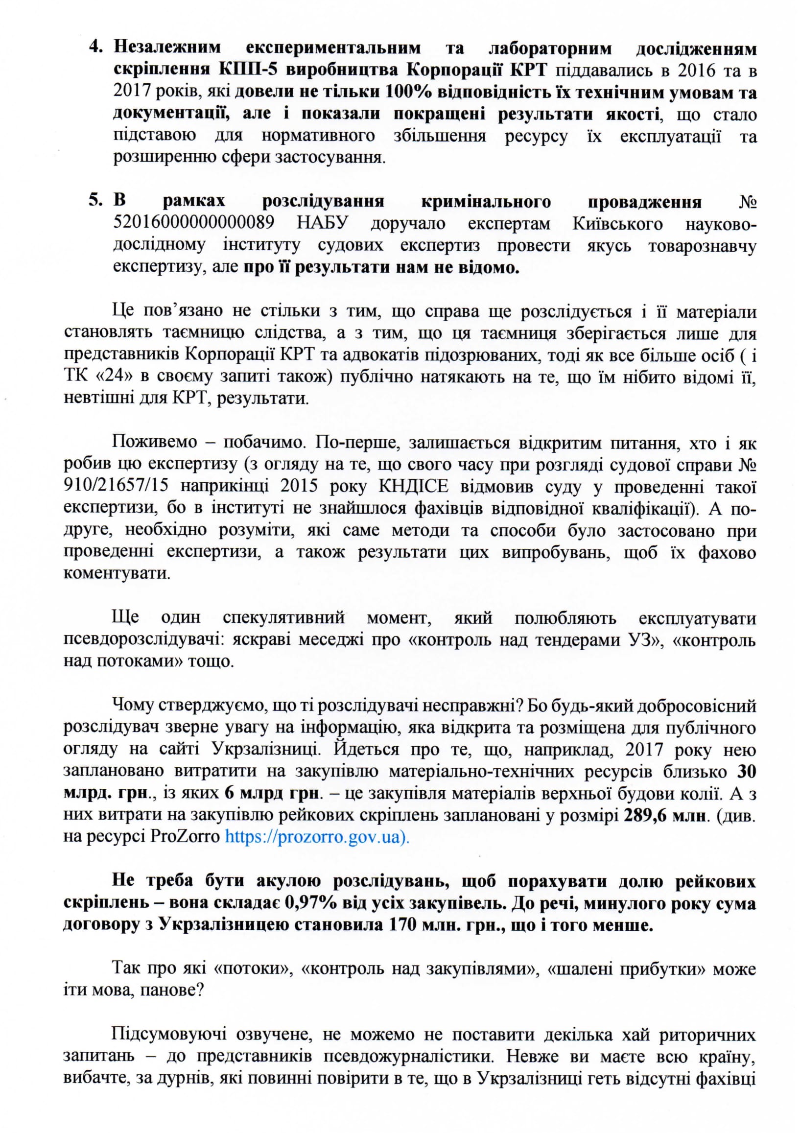 Підсумовуючі озвучене, не можемо не поставити декілька хай риторичних запитань – до представників псевдожурналістики. Невже ви маєте всю країну, вибачте, за дурнів, які повинні повірити в те, що в Укрзалізниці геть відсутні фахівці та просто адекватні люди? Що на стратегічному підприємстві працюють ті, хто масово ігнорує вимоги безпеки (а цими питаннями, крім залізничників, до речі, опікується ще і такий центральний орган виконавчої влади як «Укртрансбезпека»). Що якість продукції не перевіряється й вона, продукція, може загрожувати безпеці пасажирів? Що в одному з найбільших та найпотужніших державних підприємств країни ідуть на поступки якійсь Корпорації КРТ й закупають її продукцію 15 років на догоду певним впливовим особам? При цьому – нагадаємо – альтернативи тій продукції наразі не має (не згадуємо тут АТ Механіка, яке є фігурантом кількох кримінальних справ, пов’язаних із підробкою технічної документації, програло десятки судових процесів, та черговий розбір їх скарги в АМК України та не в змозі підтримати досягнутий технічний рівень скріплень).