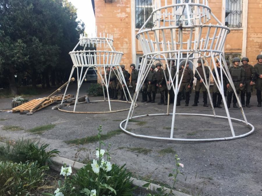 На кадрах видно, как правоохранители силой оттесняют активистов, применяя газ. Слышен грохот взрывпакетов. «Нечем дышать!», — комментирует Стерненко, не уточняя, какой именно газ распылили. Очевидно, слезоточивый.
