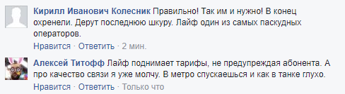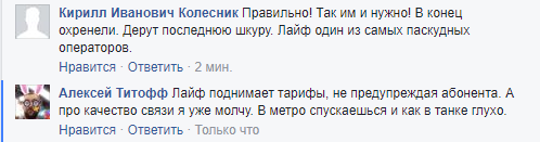 «Симпатично», «Круто, но заслуженно!», «Хоть что-то с ними сделали», «Правильно, так держать», «Неслабый штраф», «Правильно! Так им и нужно! В конец охренели. Дерут последнюю шкуру. Лайф один из самых паскудных операторов», — писали в сети.