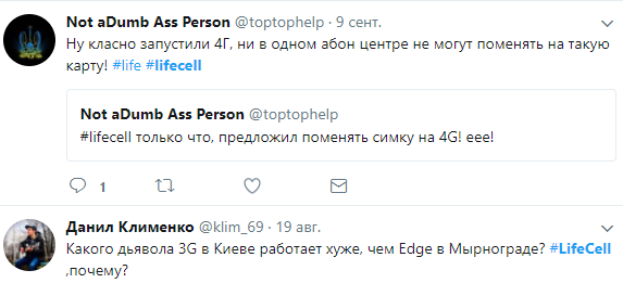 «Лайф поднимает тарифы, не предупреждая абонента. А про качество связи я уже молчу. В метро спускаешься и как в танке глухо», «Мобильные операторы меняют тарифы без предупреждения абонентов. Даже когда внесена предоплата на несколько месяцев вперед, просто ставят перед фактом, что тариф изменен на другой, более дорогой!», «Какого дьявола 3G в Киеве работает хуже, чем Edge в Мырнограде?» — пишут разгневанные клиенты Life.