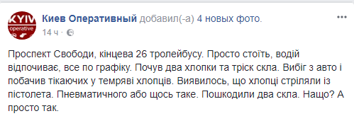 В Киеве сегодня ночью, 23 сентября, подростки расстреляли троллейбус №26 на конечной остановке на проспекте Свободы. Об этом пишет "Киев Оперативный" в Facebook.