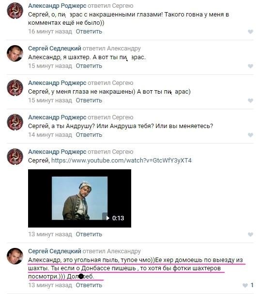 Російський пропагандист, "експерт по Україні" Олександр Роджерс, який регулярно видає статті про нищівні перемоги "Л/ДНР" над Україною, в коментарях до одного зі своїх постів обізвав "пі*арасом" шахтаря Сергія Седлецького з Вуглегірська.